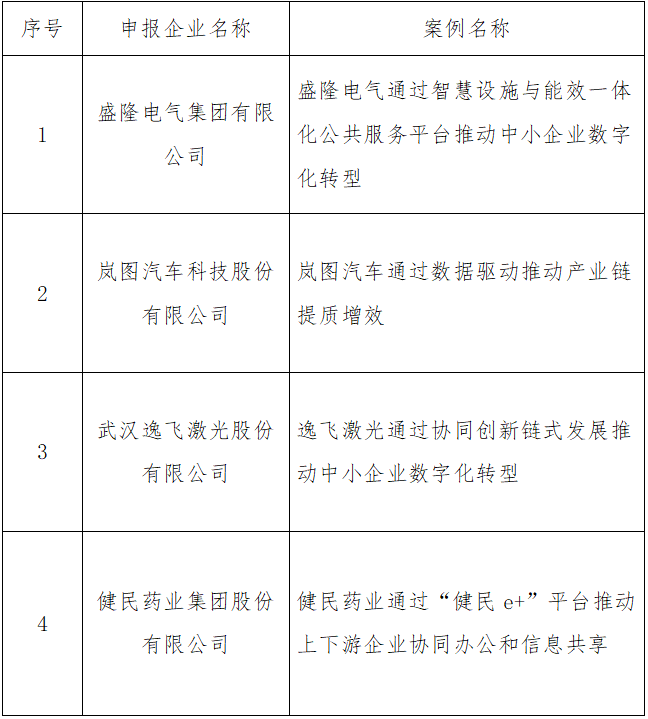 根据《关于开展2025年武汉市“链赋江城”中小企业“链式”数字化转型典型案例征集遴选工作的通知》相关规定及要求,经企业申报、区经信部门推荐和专家评审,拟认定“盛隆电气通过智慧设施与能效一体化公共服务平台推动中小企业数字化转型”等4个案例为2025年武汉市“链赋江城”中小企业“链式”数字化转型典型案例。