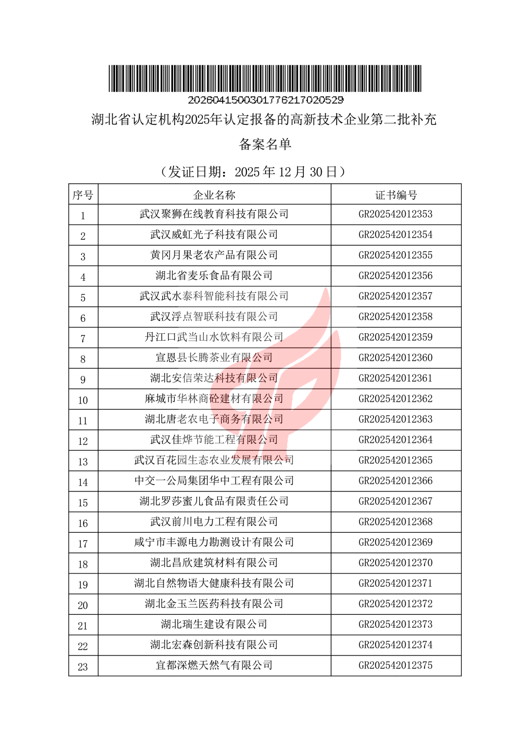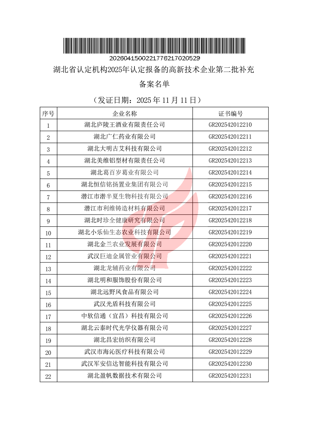 对湖北省认定机构2025年认定报备的高新技术企业进行第二批补充备案的公告